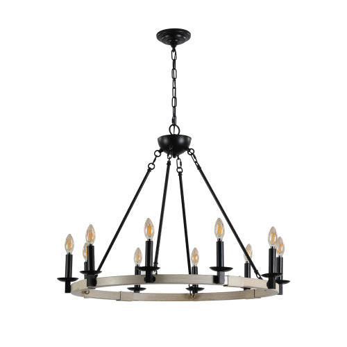 32" Rustic Farmhouse 10-Light Candle Chandelier -Matte Black & White Oak