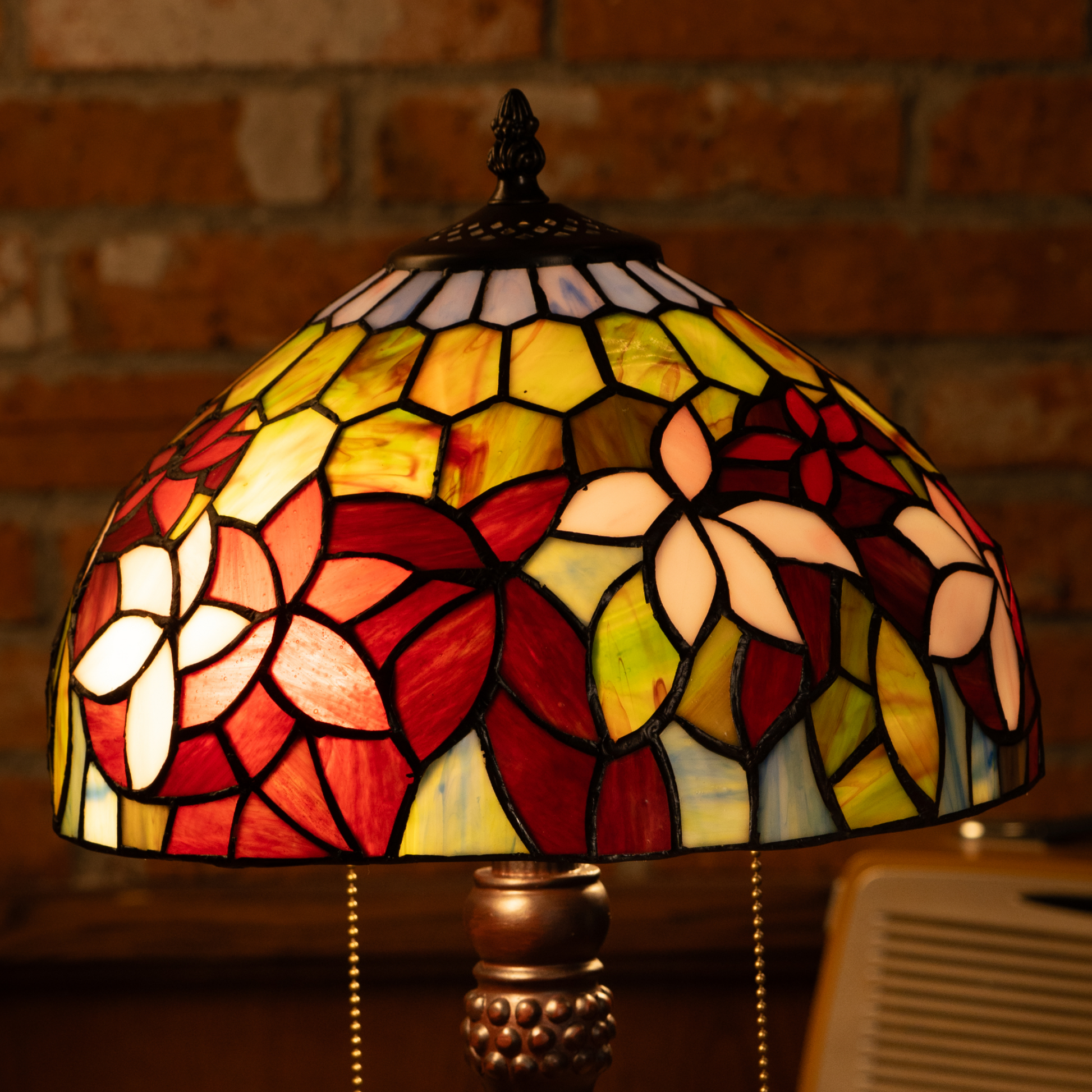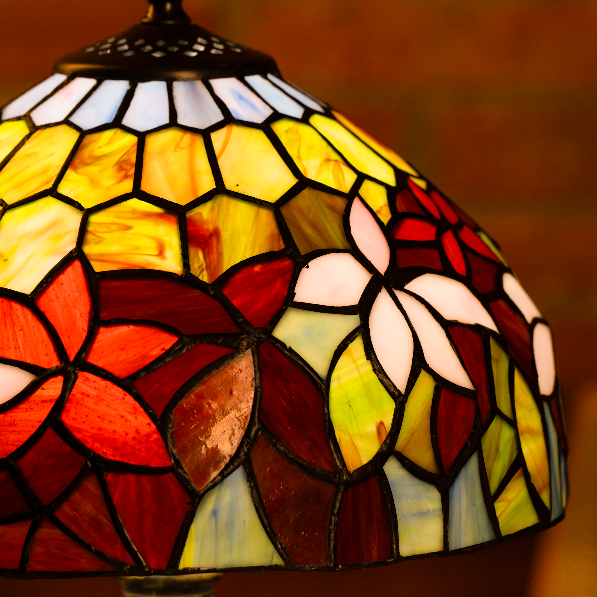 Handcrafted stained glass in rich amber, deep red, and warm gold tones creates a soft, inviting ambiance, perfect for autumn-inspired décor.