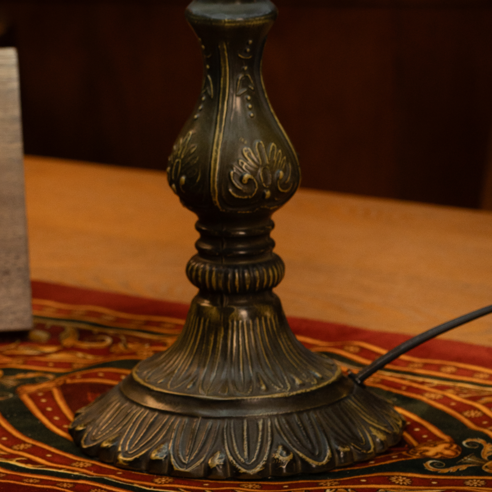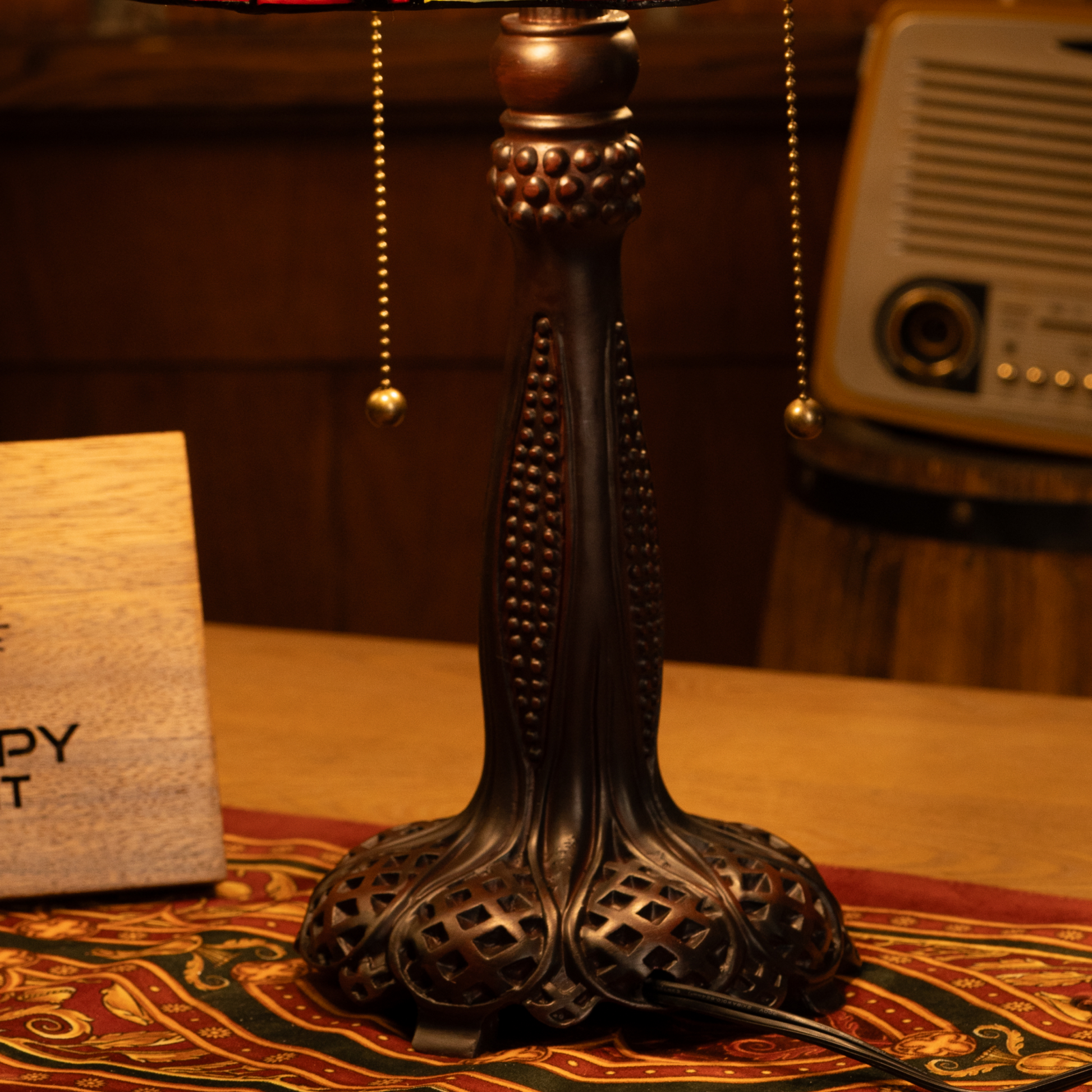 - Material: Stained Glass Shade, Durable Metal Base with Antique Bronze Finish