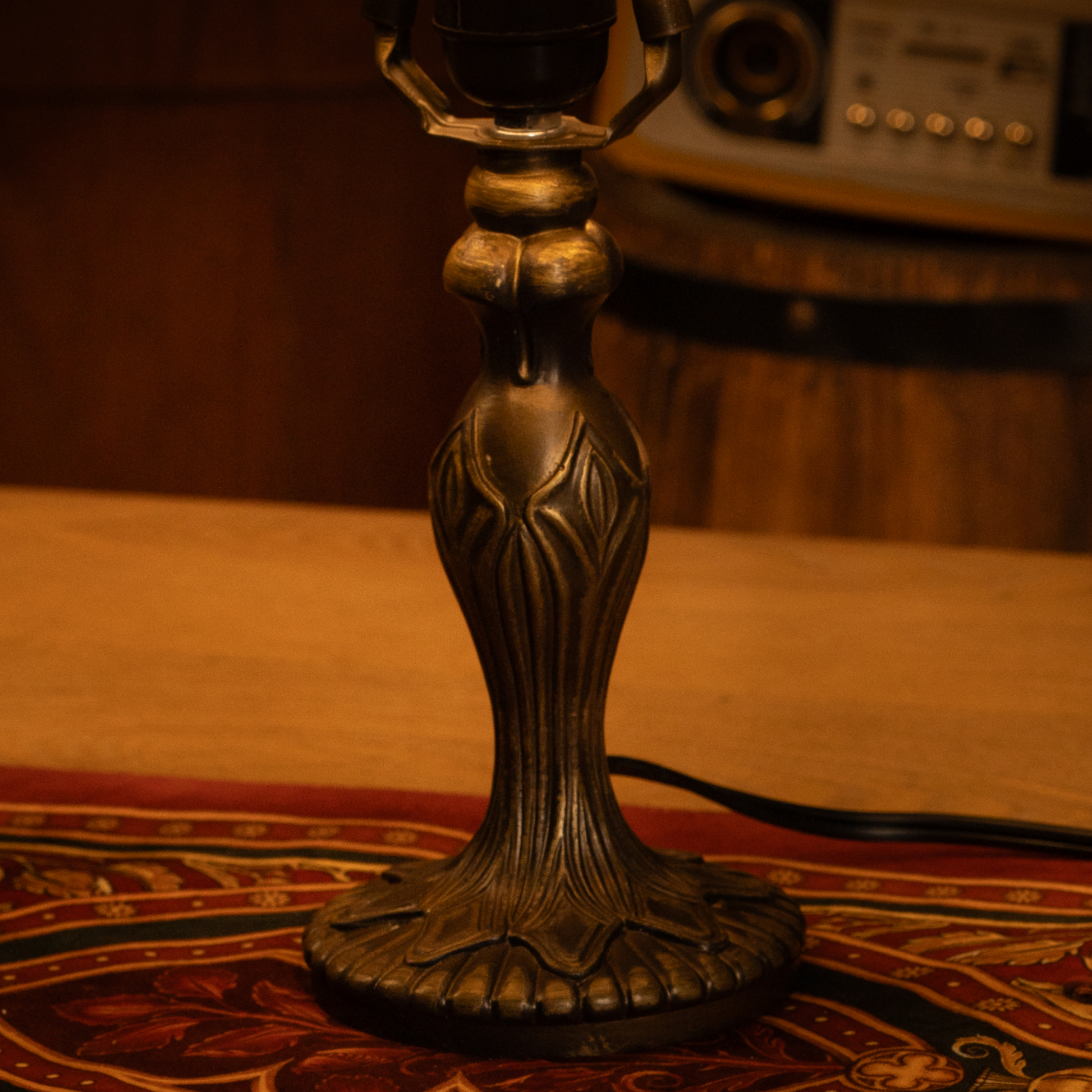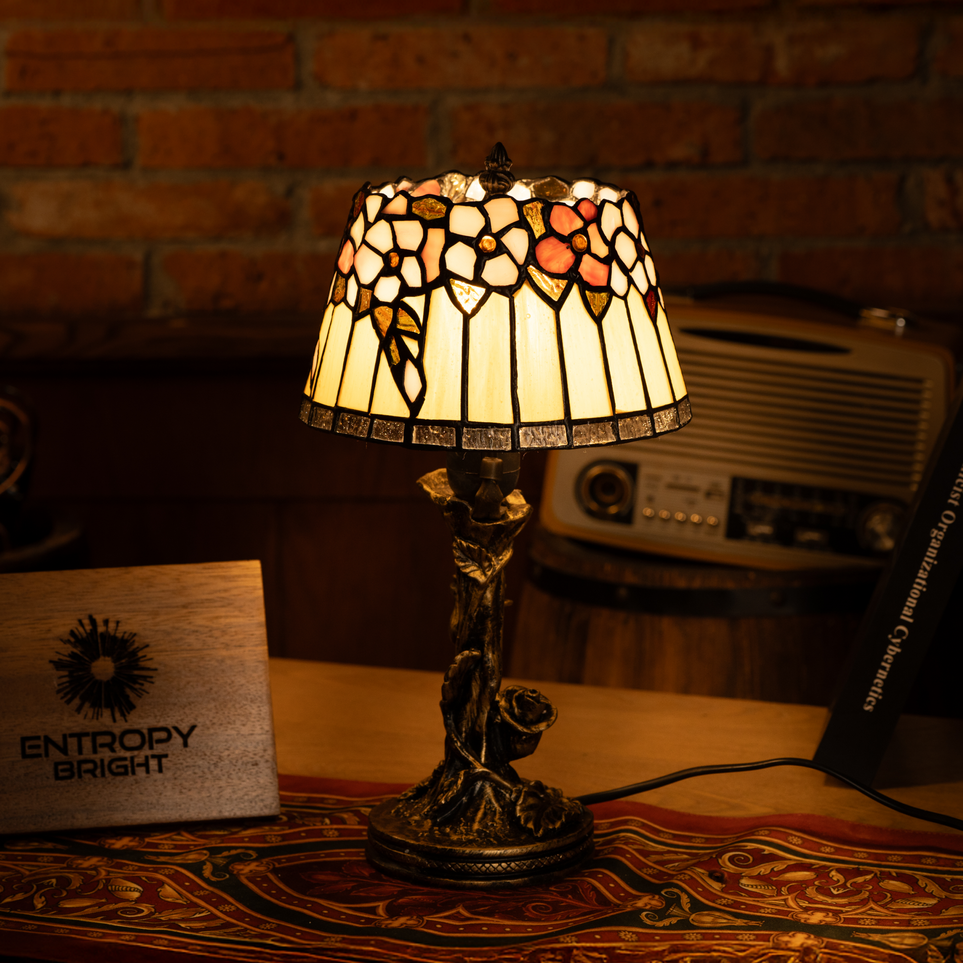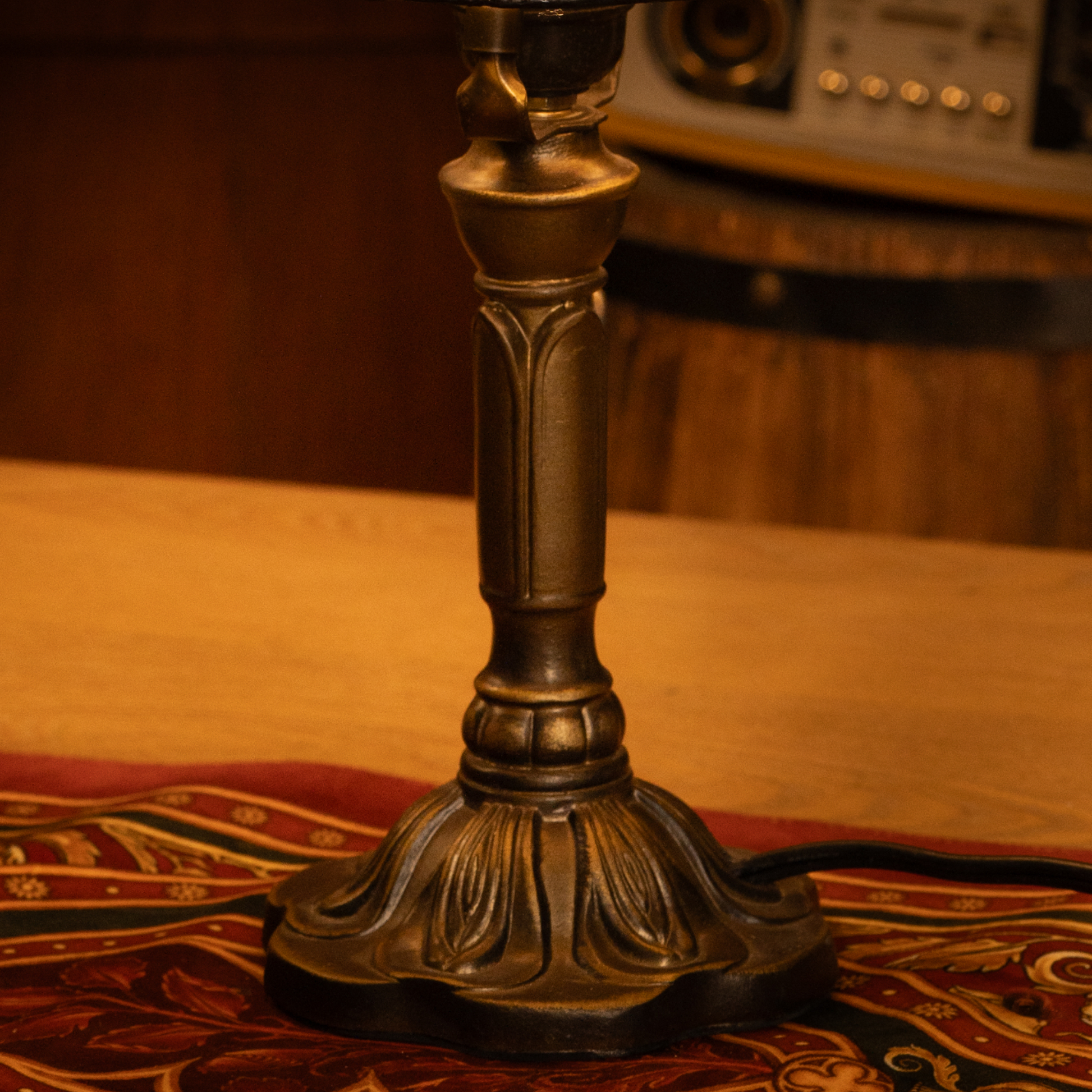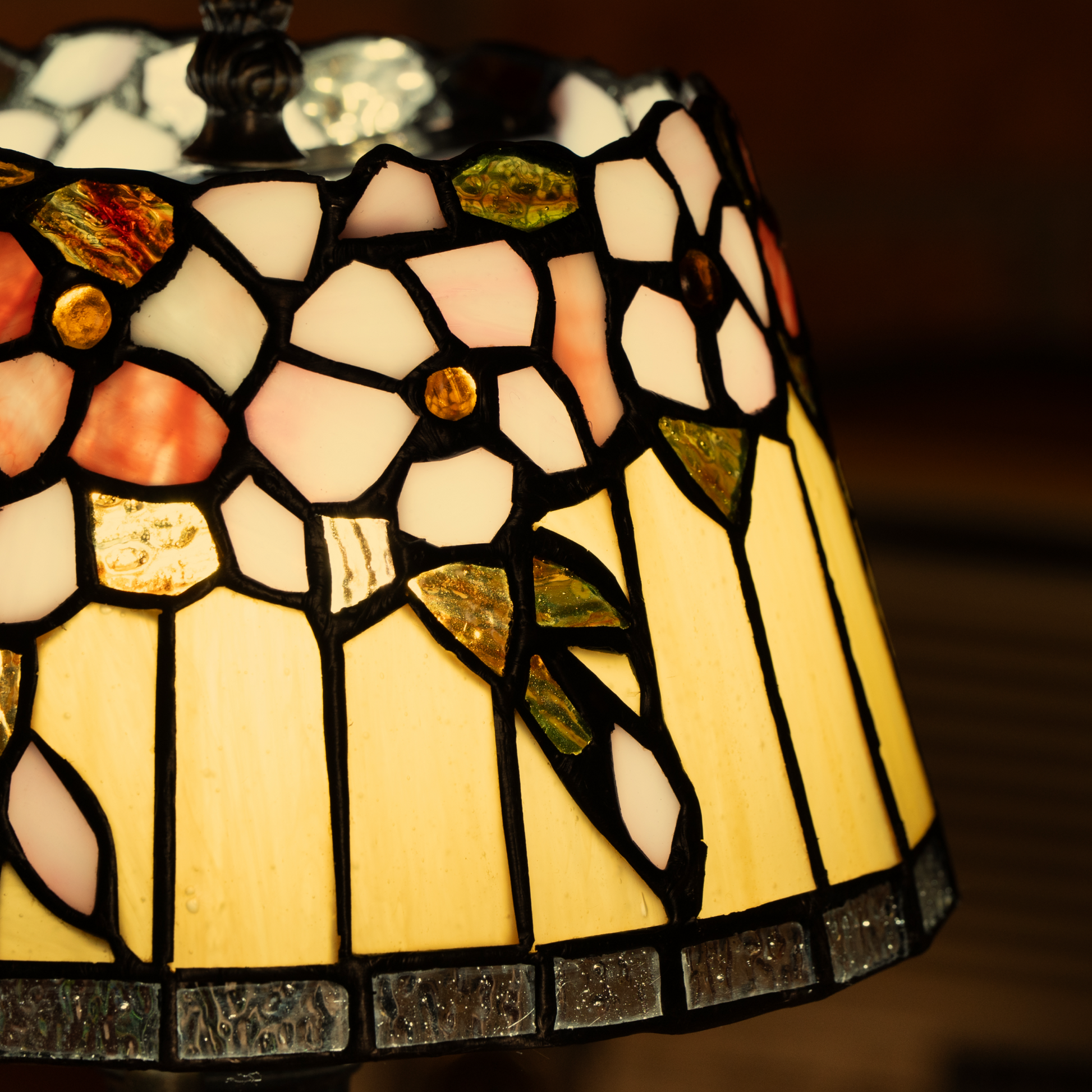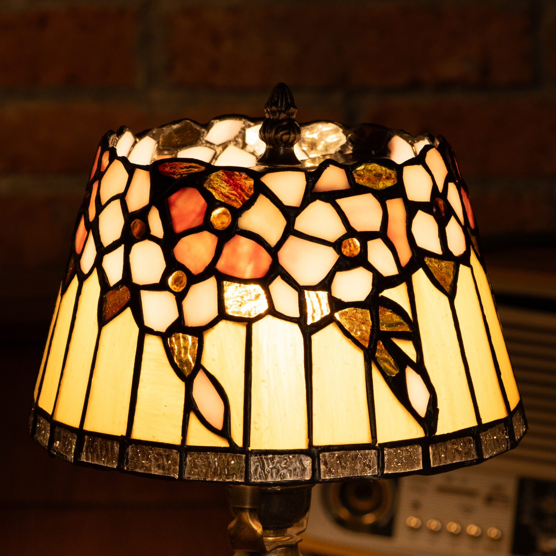 Featuring a handcrafted stained glass shade in rich amber tones, soft creams, and deep reds, this lamp casts a warm, tranquil light that enhances any space.