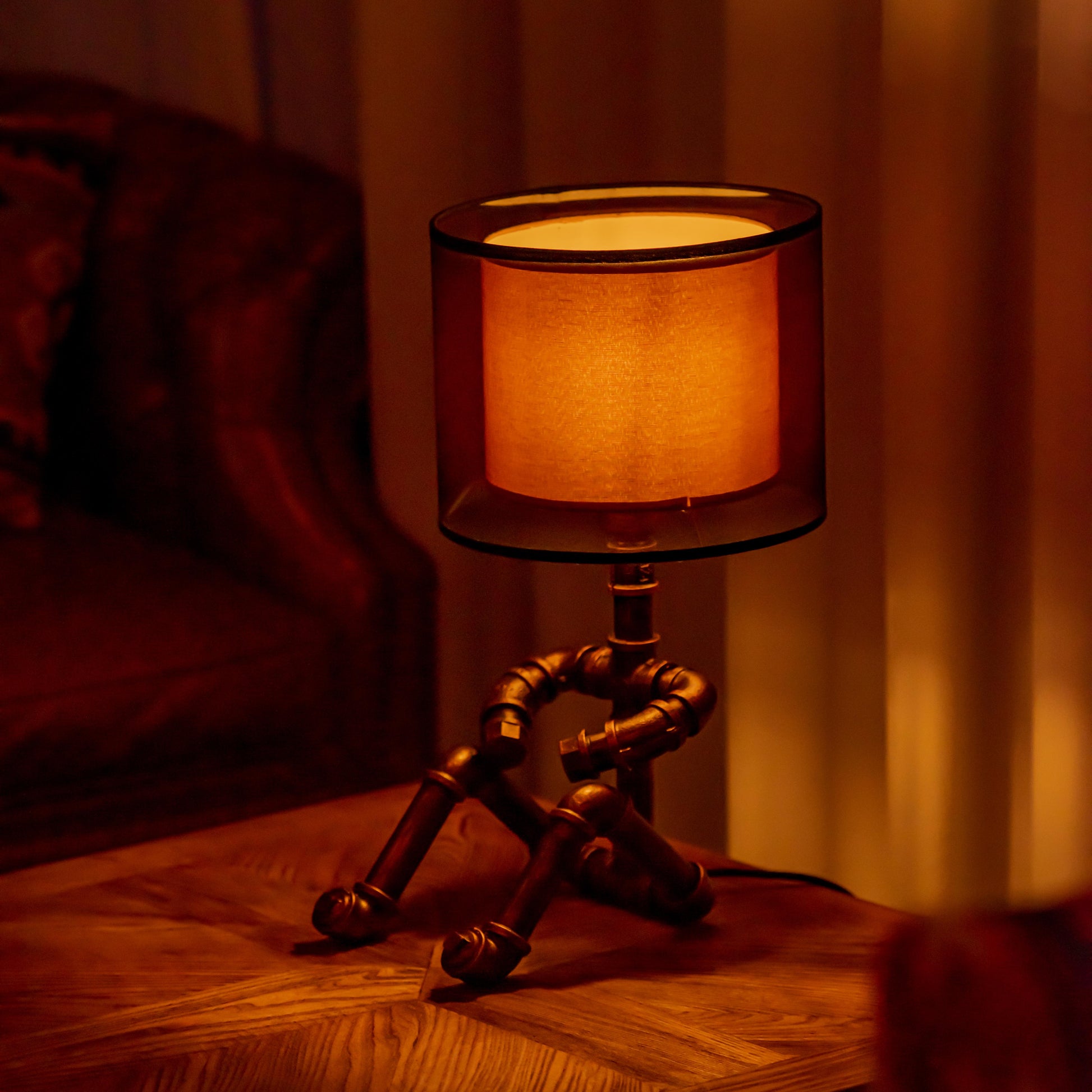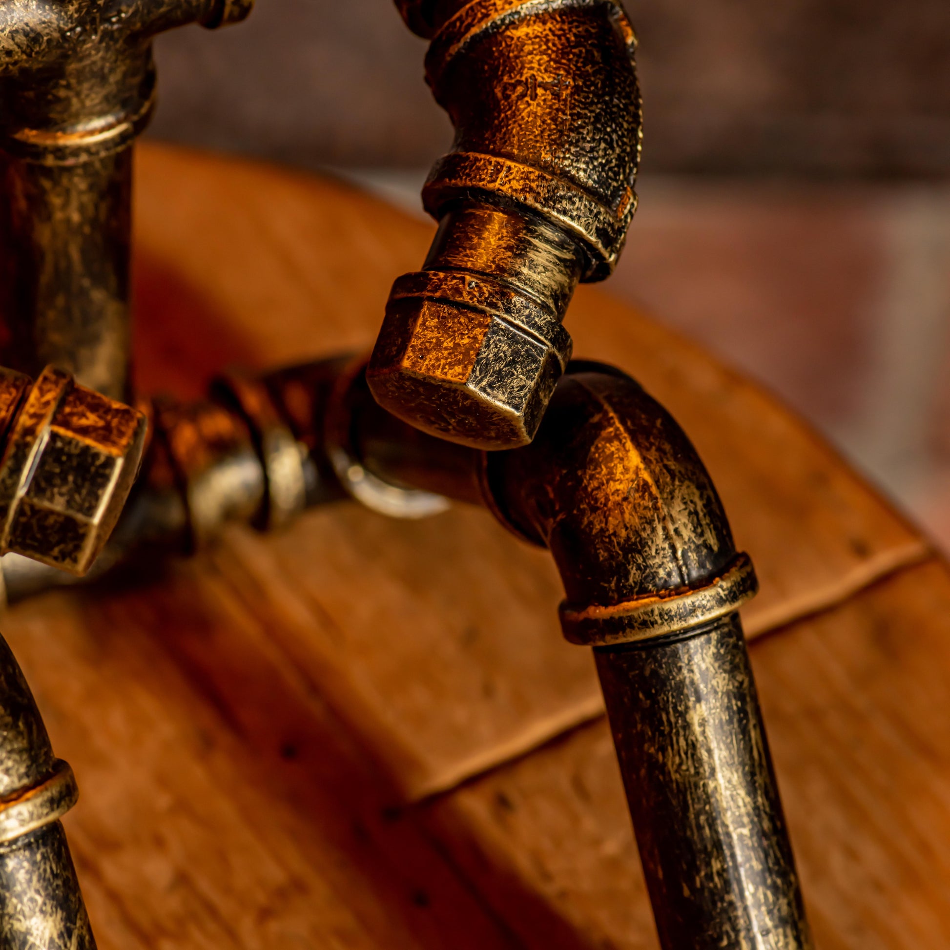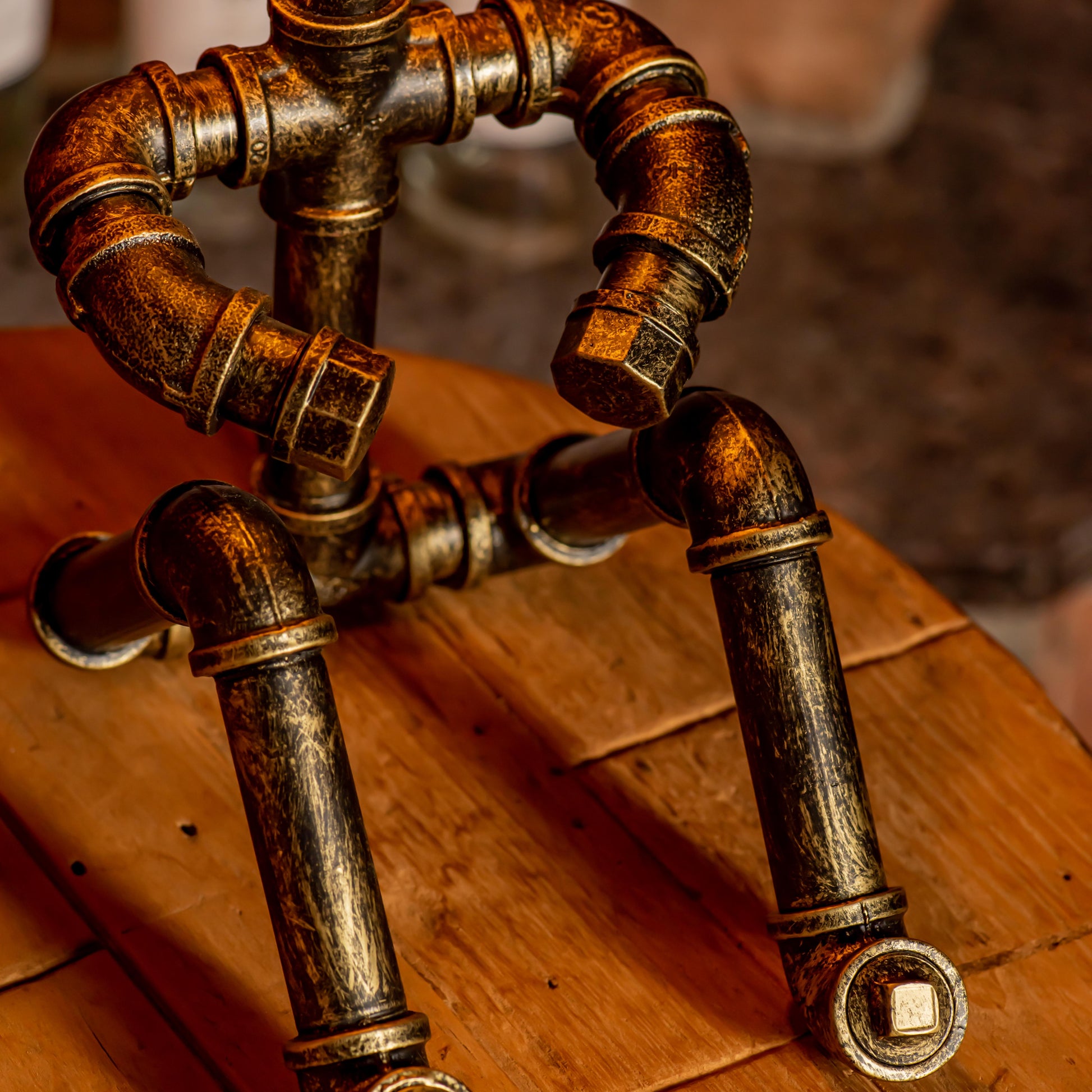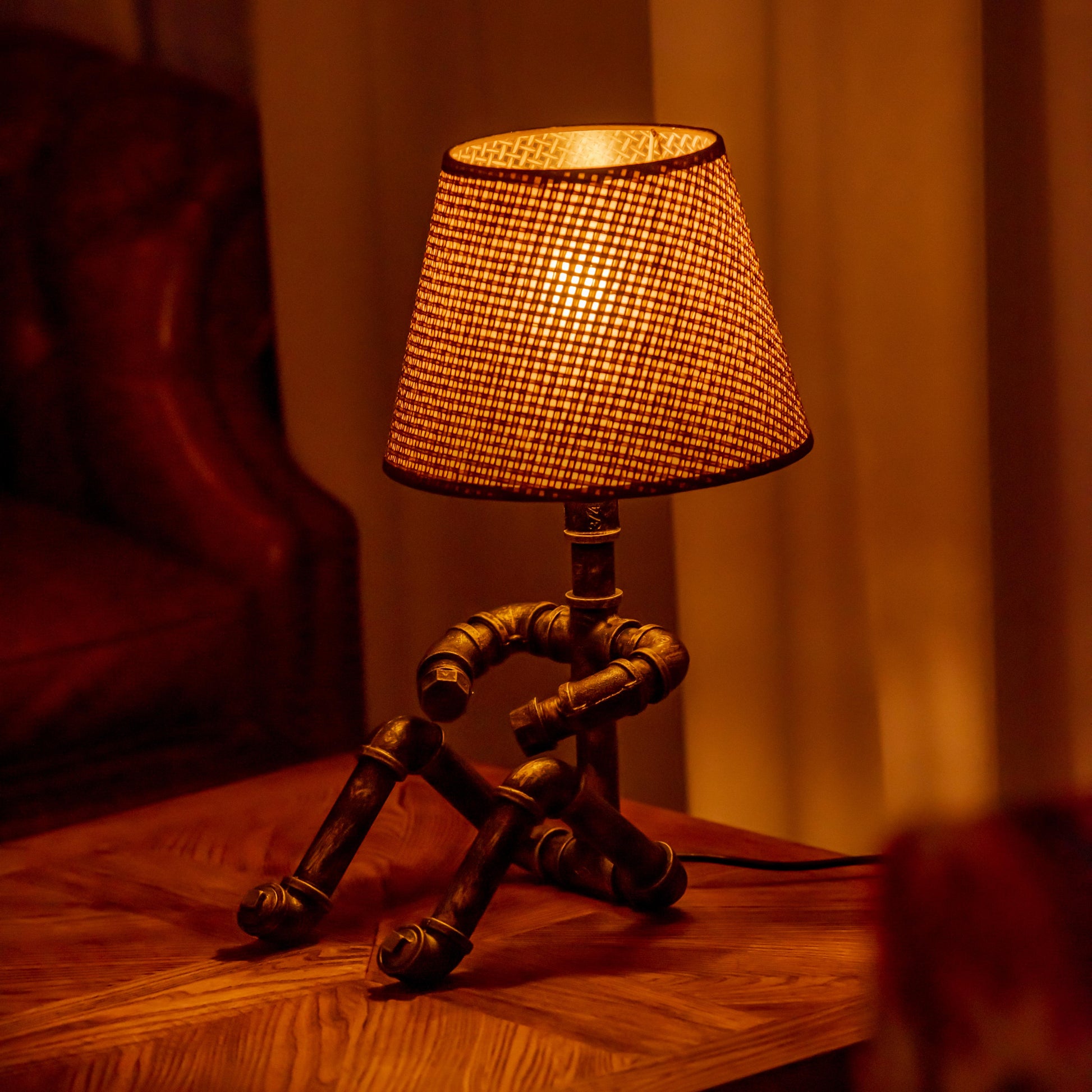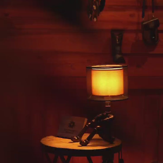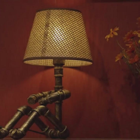 Crafted from durable 1/2" malleable cast iron pipes, this robot-inspired lamp features a raw, industrial look with a steampunk flair. The antique water pipe structure adds vintage charm, making it a standout décor piece.