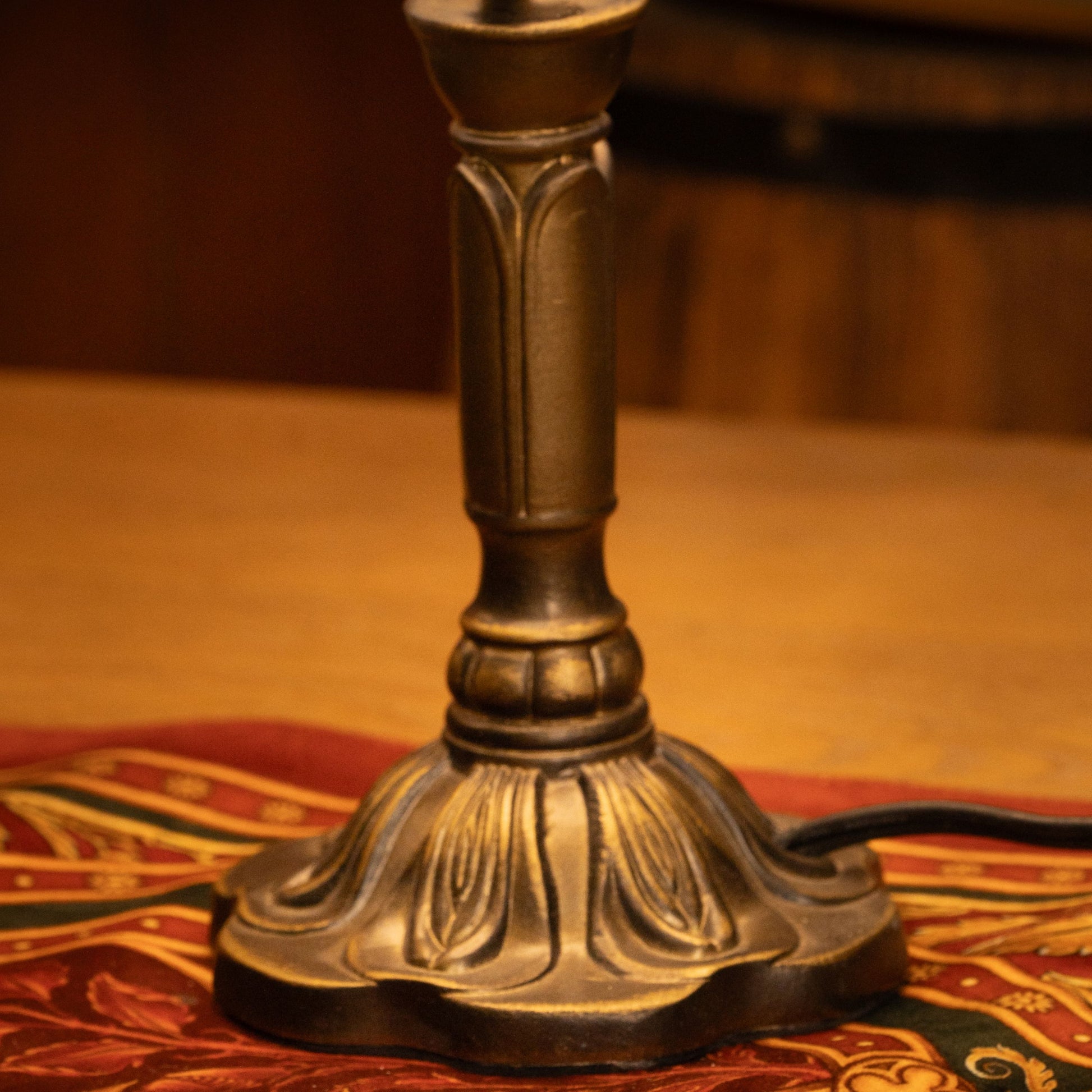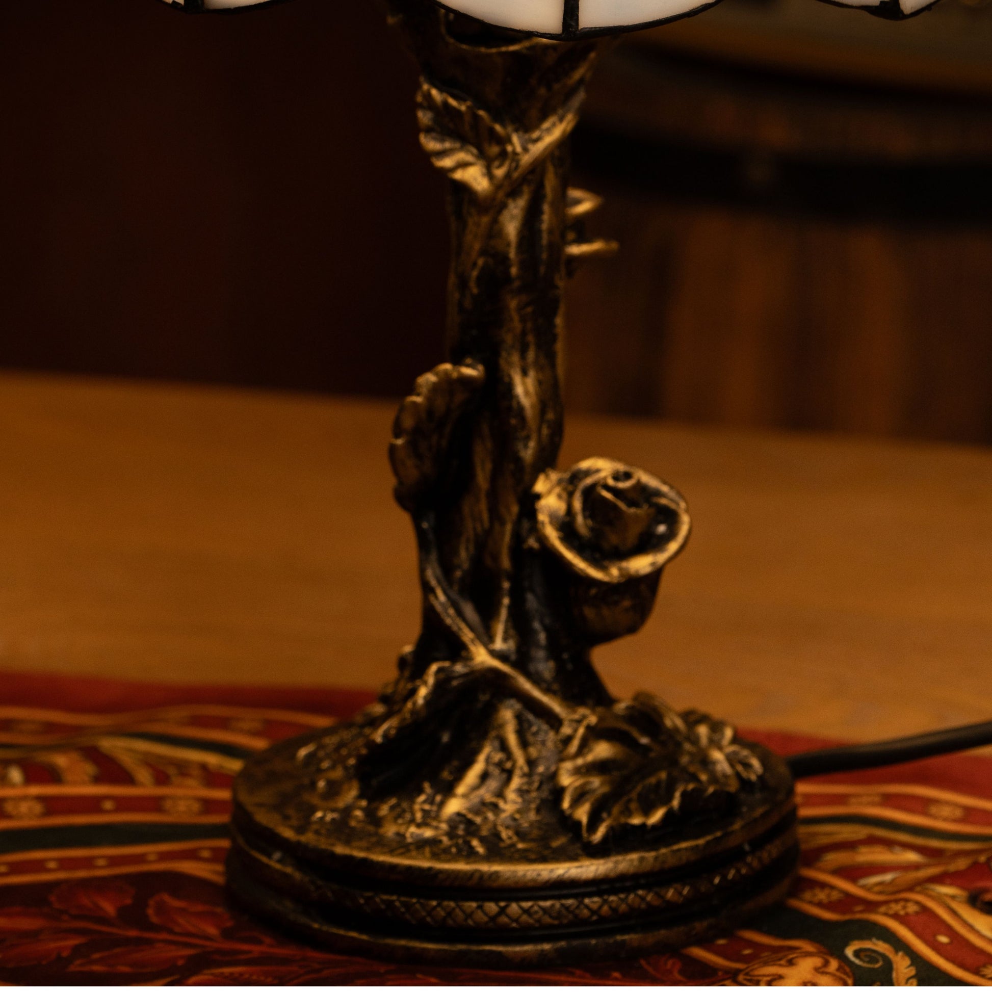 - Material: Stained Glass Shade, Durable Metal Base with Antique Bronze Finish