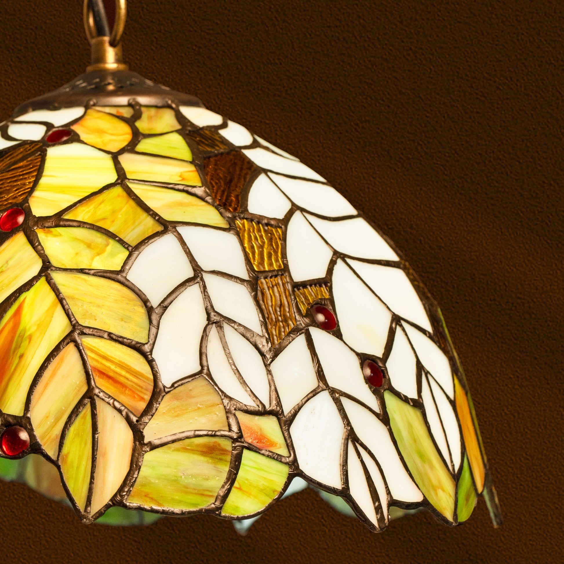 The Golden Leaf Whisper Tiffany Pendant features a meticulously handcrafted stained glass shade, adorned with golden and ivory leaves accented by delicate red glass jewels. Its rich, earthy tones create a warm and inviting glow, perfect for intimate spaces.