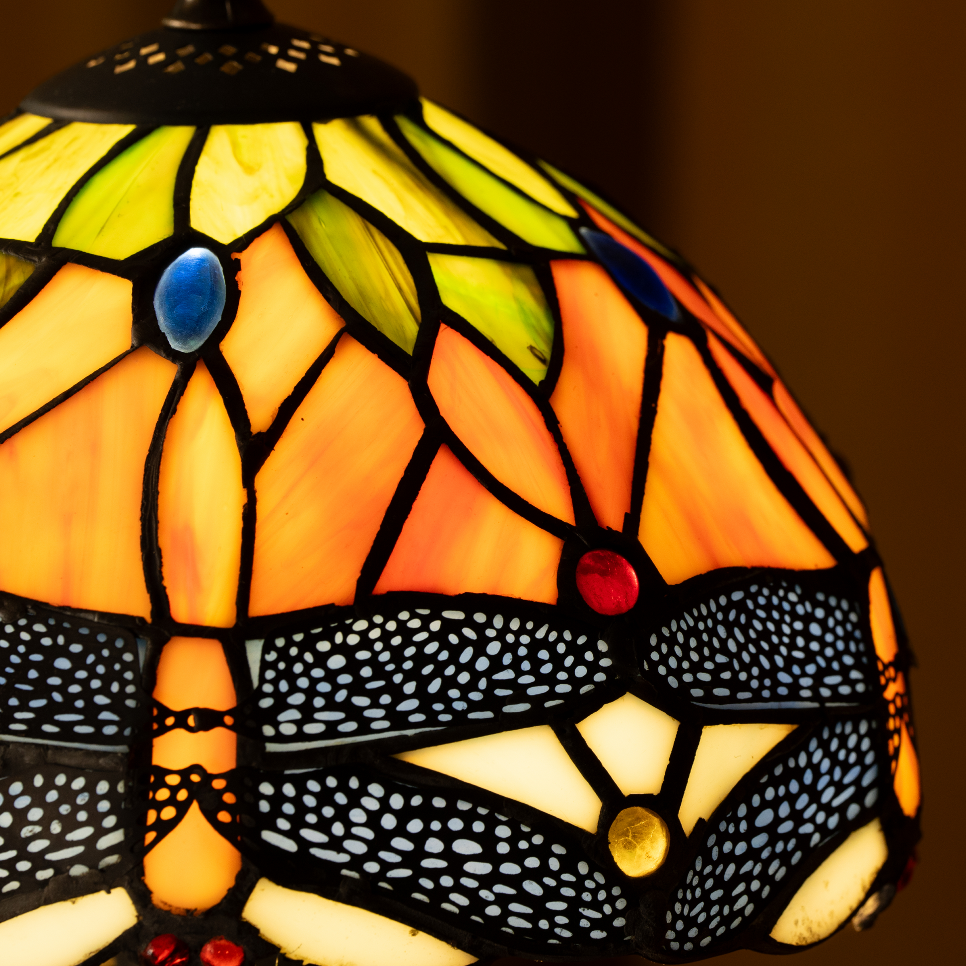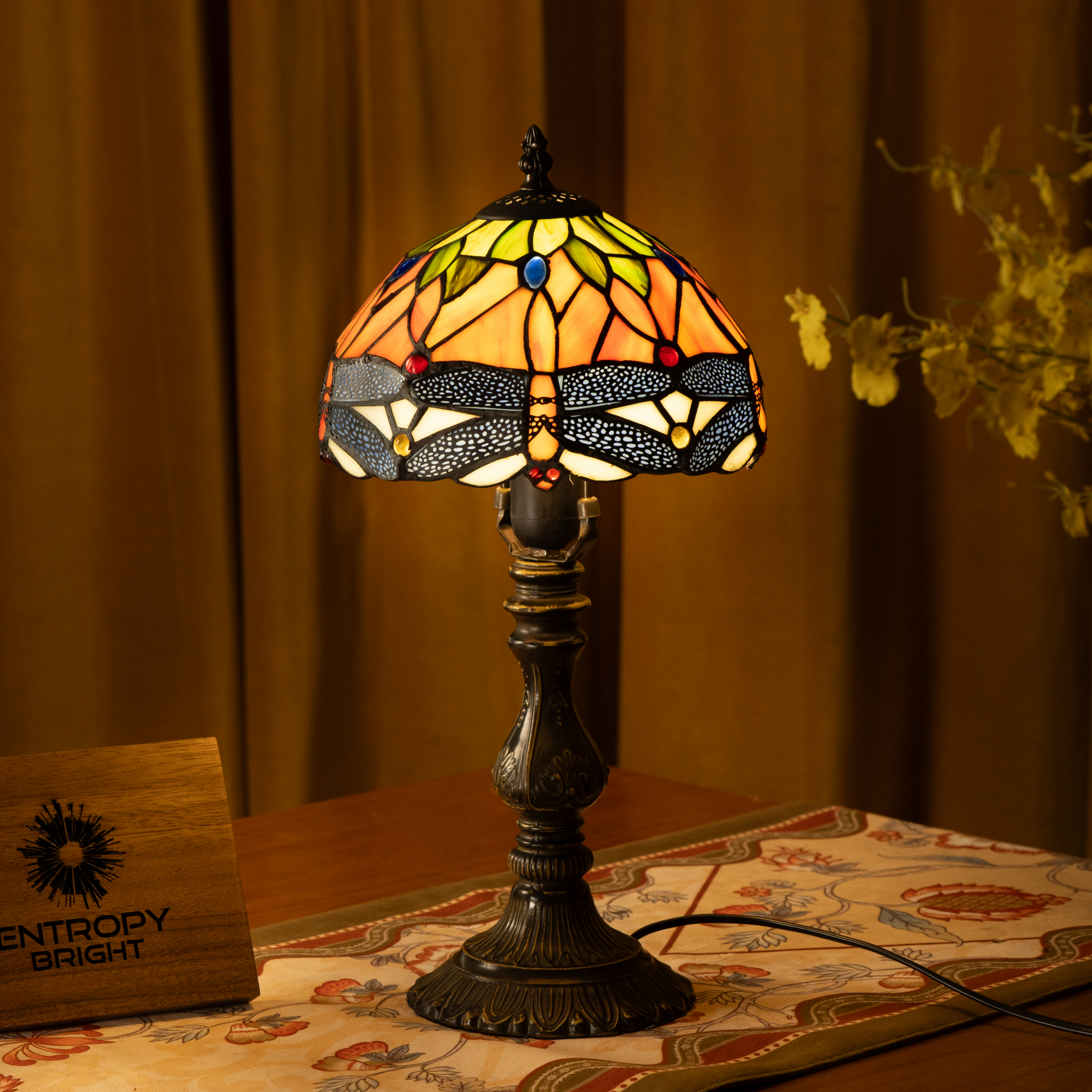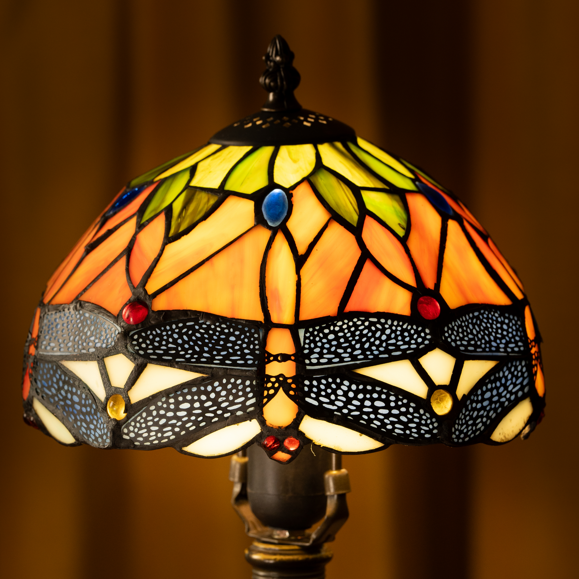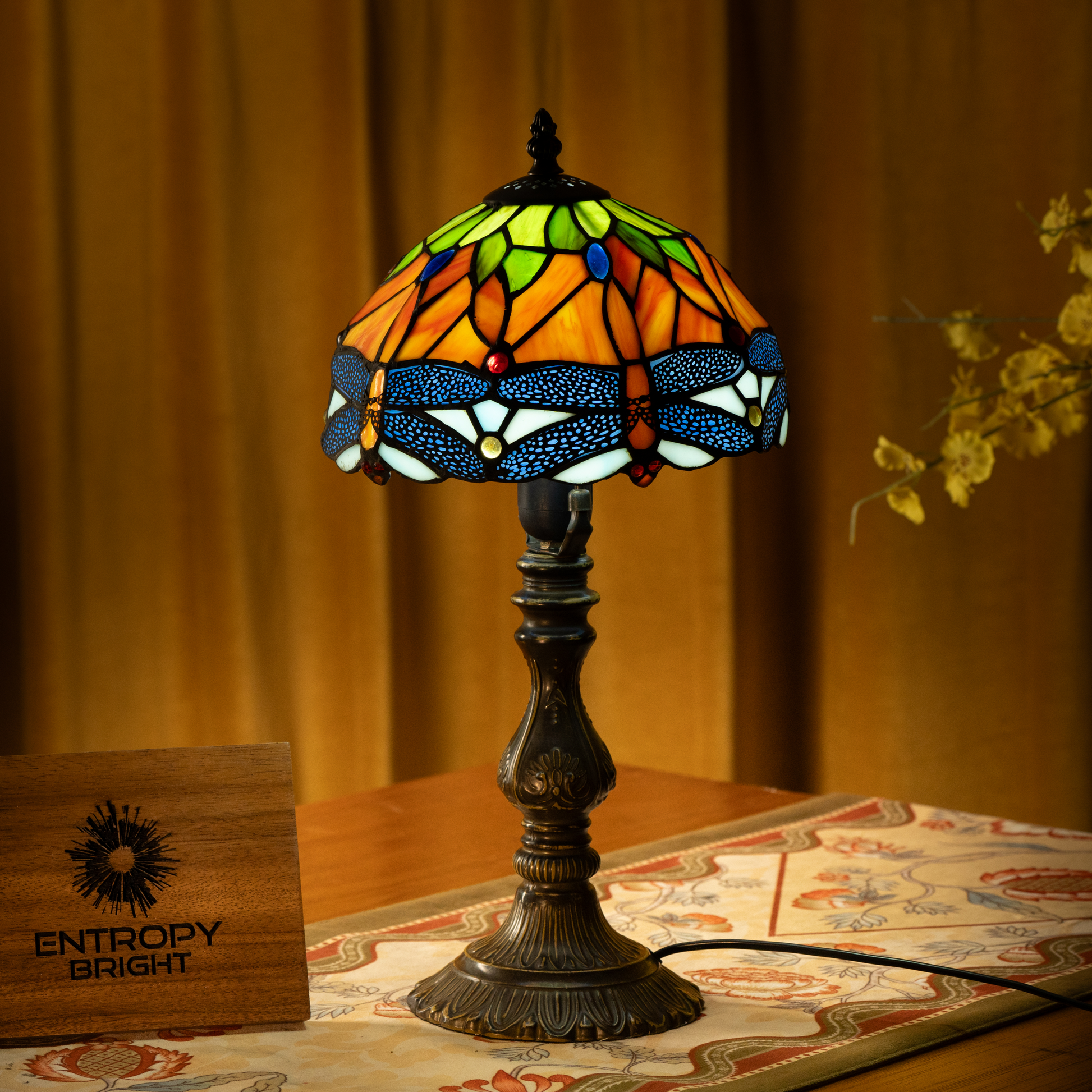 Golden dragonflies and deep blue accents create a mesmerizing stained glass shade, casting a warm, inviting glow.