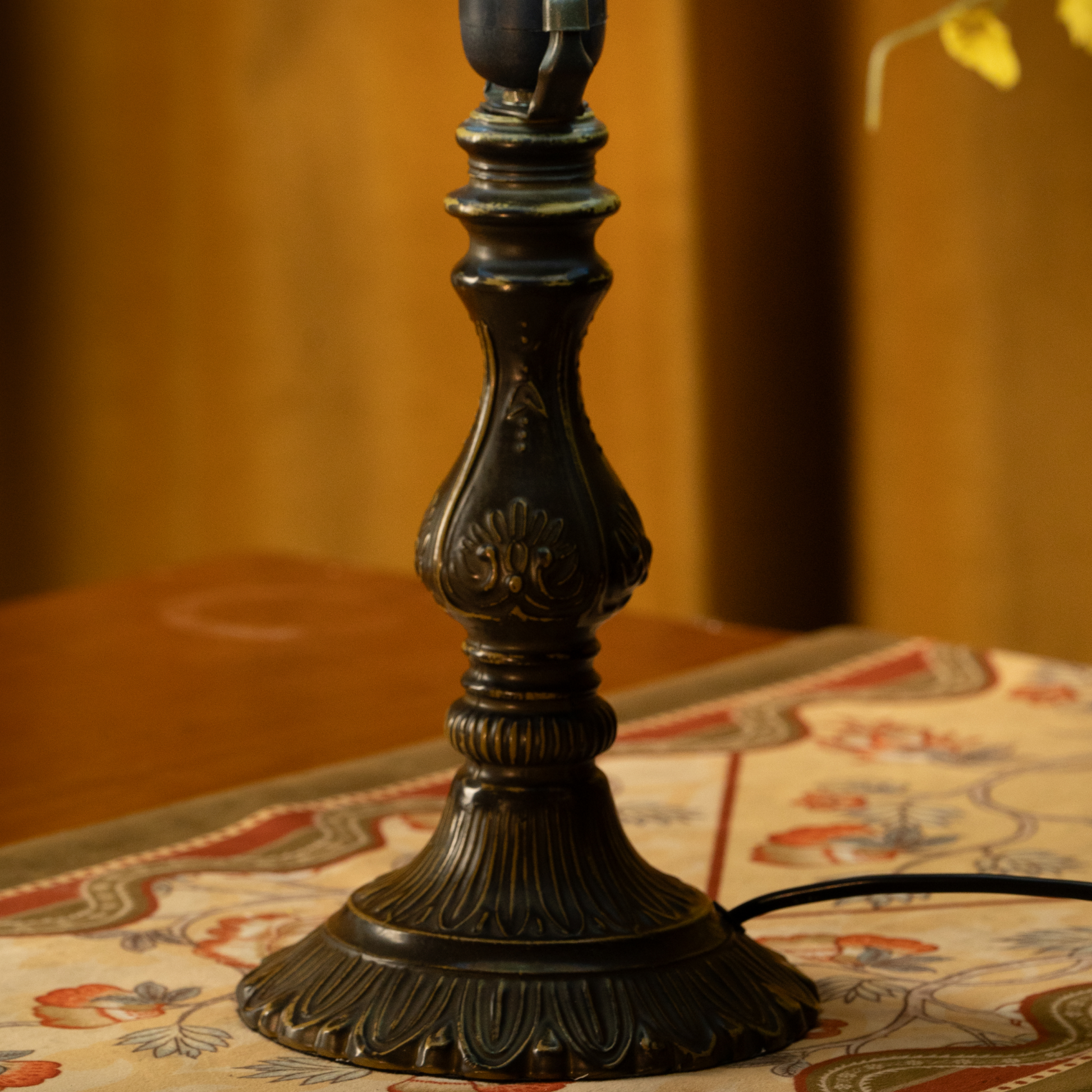 Paired with an ornate bronze-finished base, this lamp brings vintage elegance to bedrooms, studies, and reading nooks.