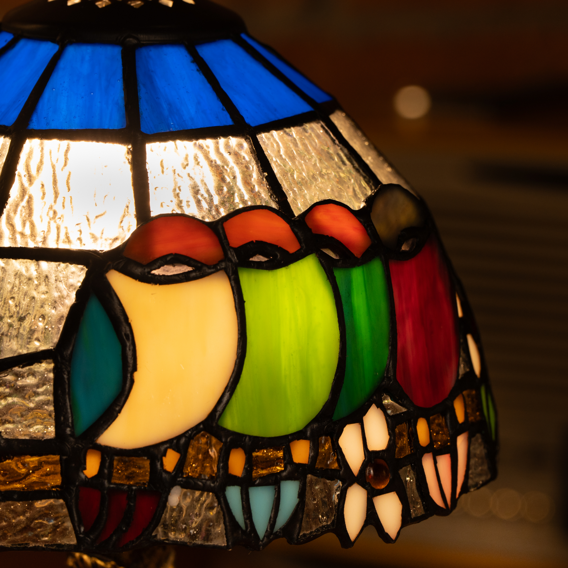 A beautifully handcrafted stained glass shade featuring a harmonious blend of vibrant colors creates a warm and uplifting ambiance in any space.