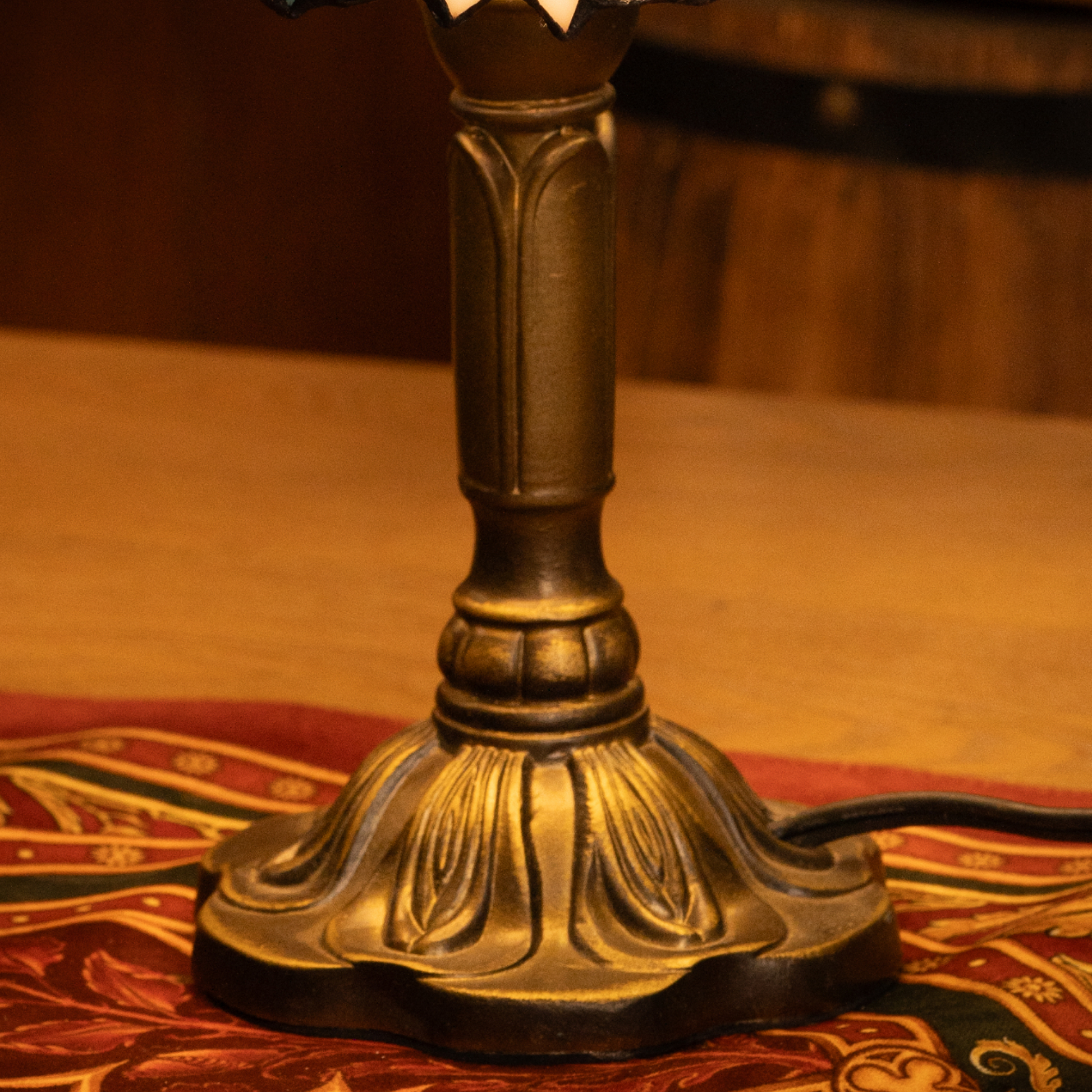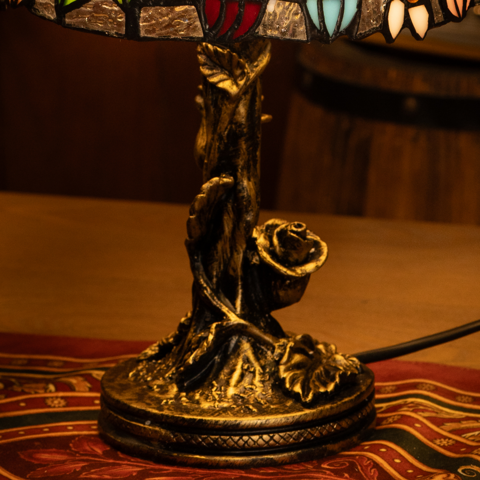 - Material: Stained Glass Shade, Durable Metal Base with Antique Bronze Finish