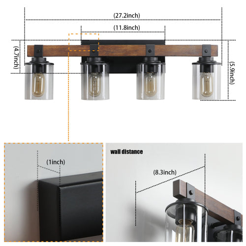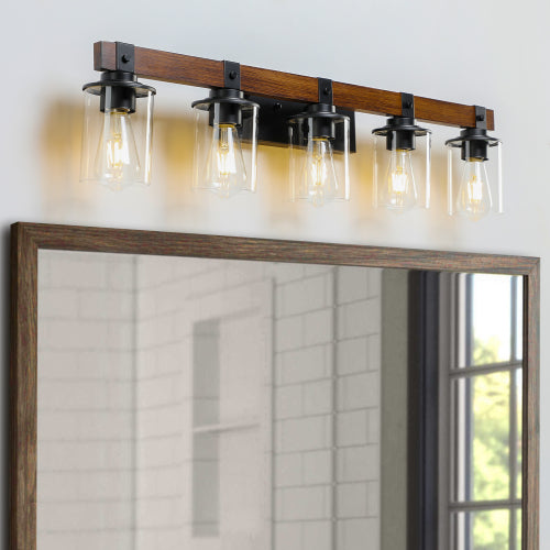 Blending black iron with real wood accents and clear glass shades, this vanity light fixture perfectly complements farmhouse, industrial, and modern rustic d??cor. Its simple yet refined design adds warmth and character to bathrooms, vanities, and powder rooms.